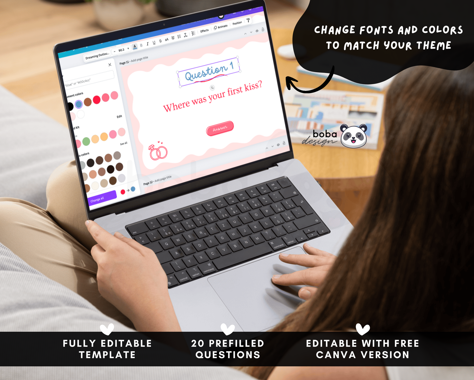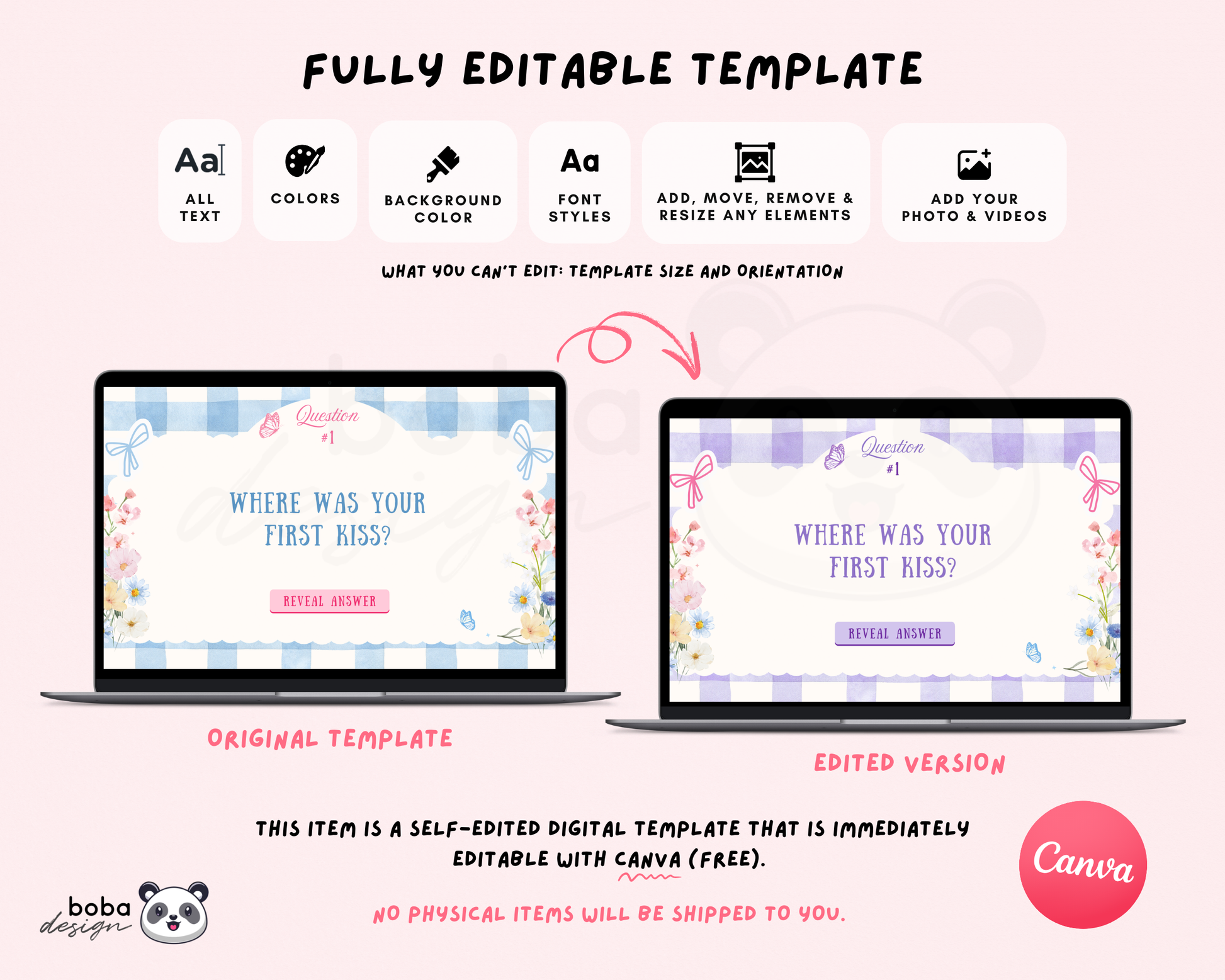 Fully editable in Canva so you can match the colors, text, and questions to your party style.