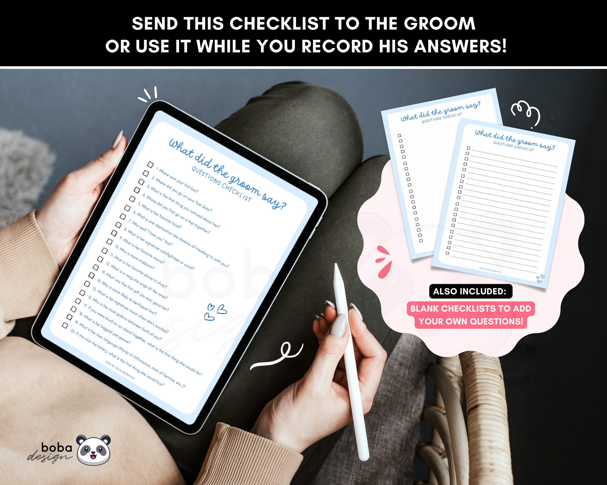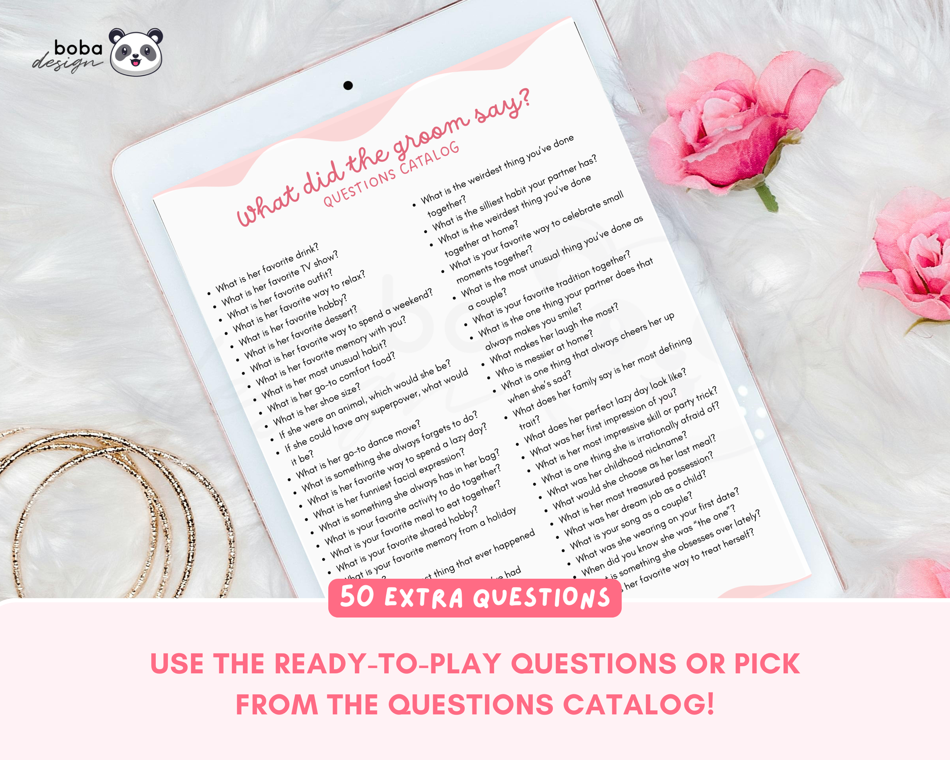 Bring laughs to your bachelorette party with this What Did the Groom Say? game. The bride guesses the groom’s answers to 20 fun questions. Easy to play, fun for everyone, and perfect for making memories with your friends.