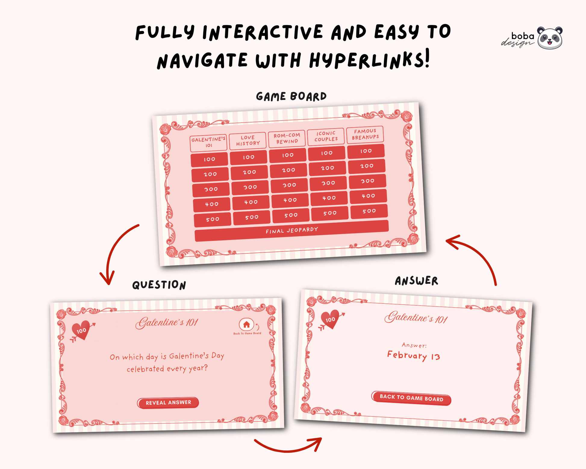 • Interactive buttons for smooth navigation (reveal answers, go back to board, etc.)