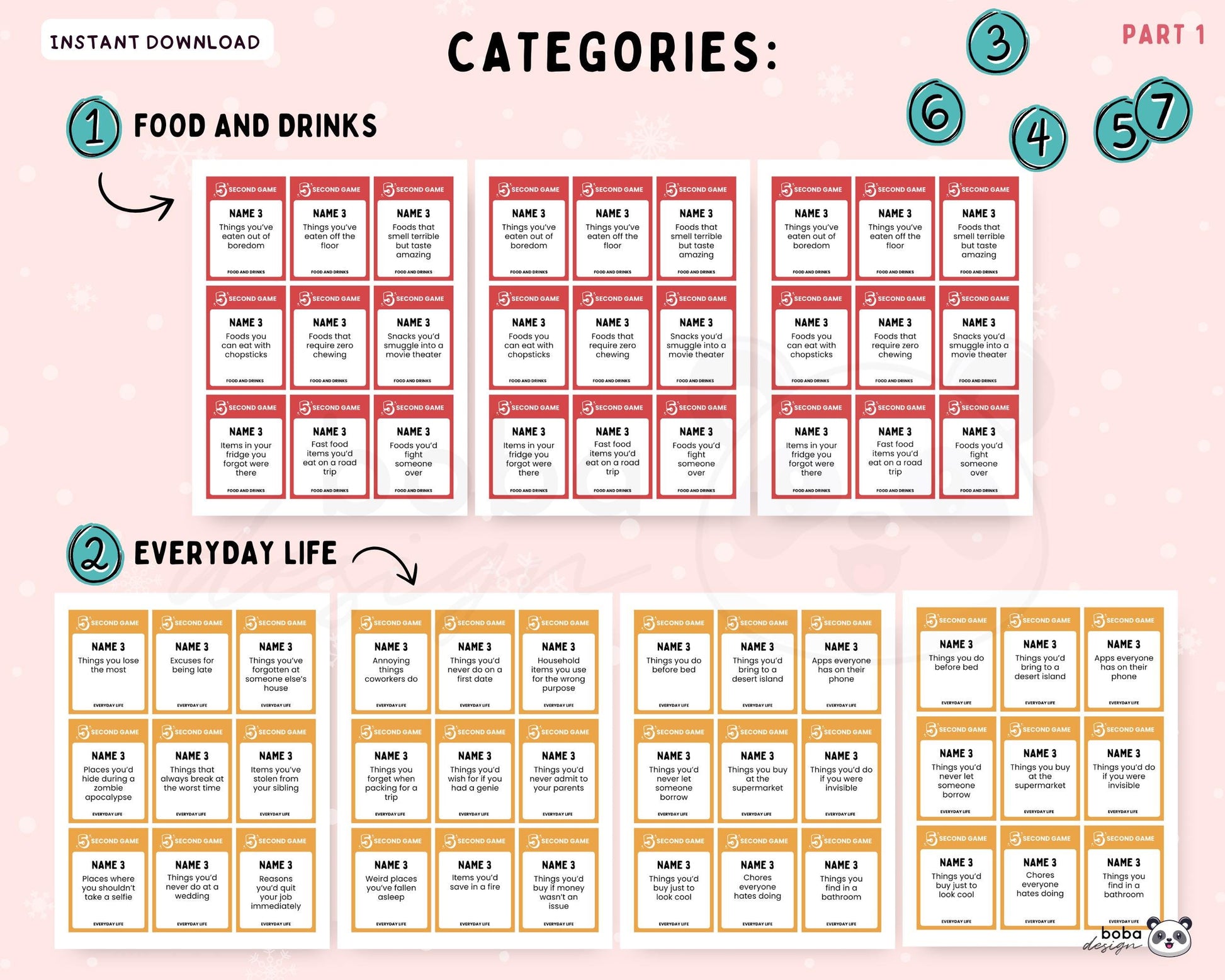 - Includes 9 FREE blank cards for each category (7 pages) to add your personal touch!
