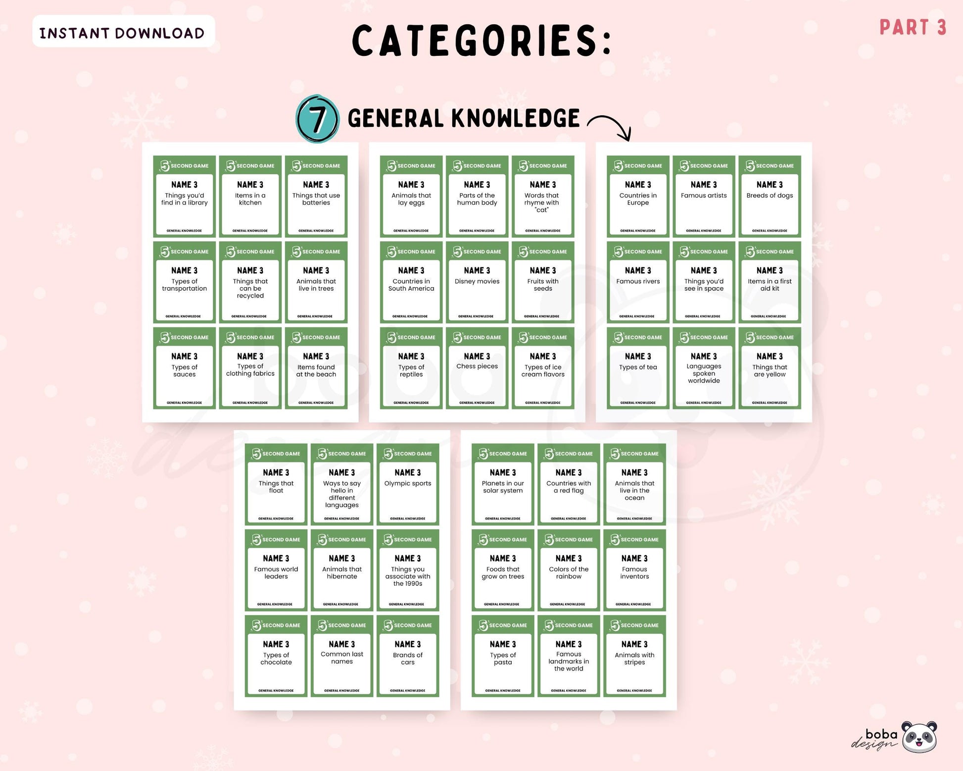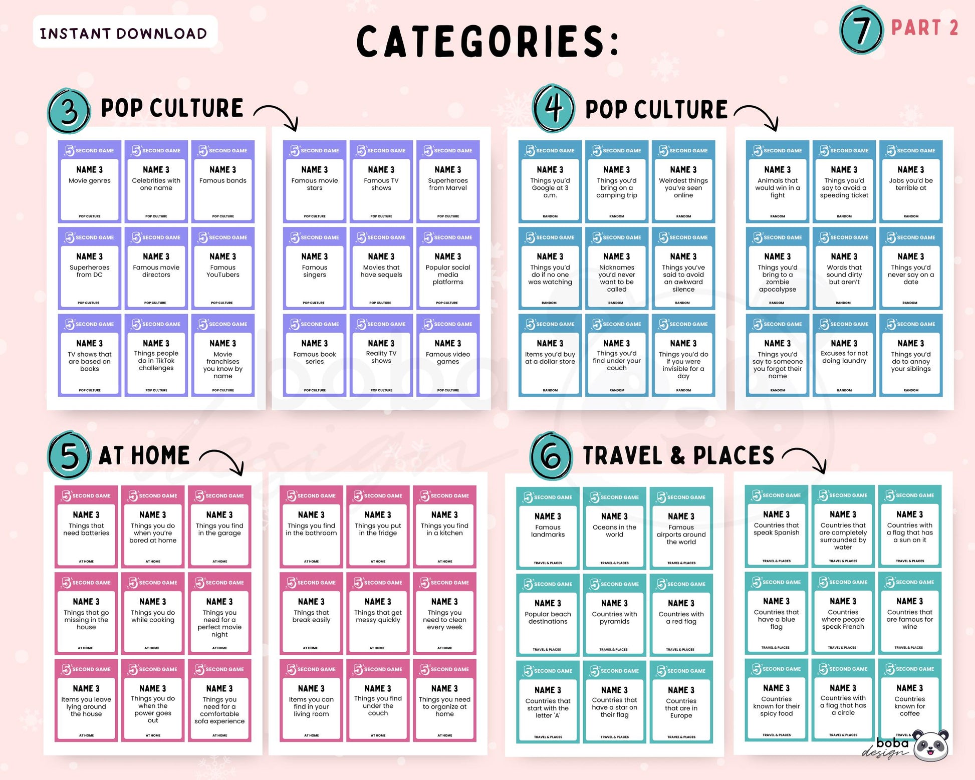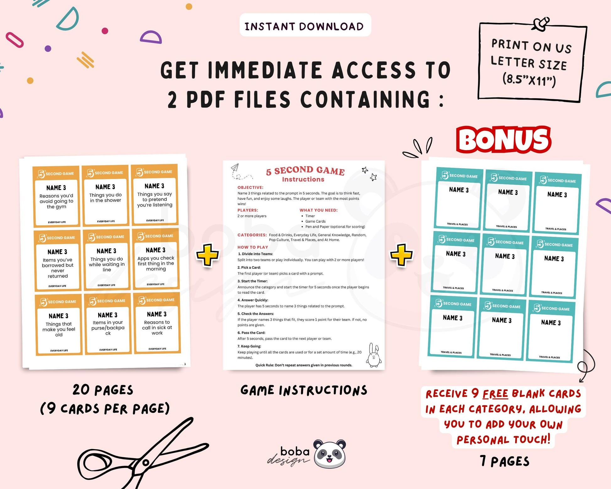 Get ready for endless fun with this 5-Second Game. It is super easy. Just download, print, cut, and play. With 7 exciting categories, 20 pages, and a total of 180 cards, there is something for everyone to enjoy. Perfect for all ages, this game will have everyone laughing and competing in no time.
