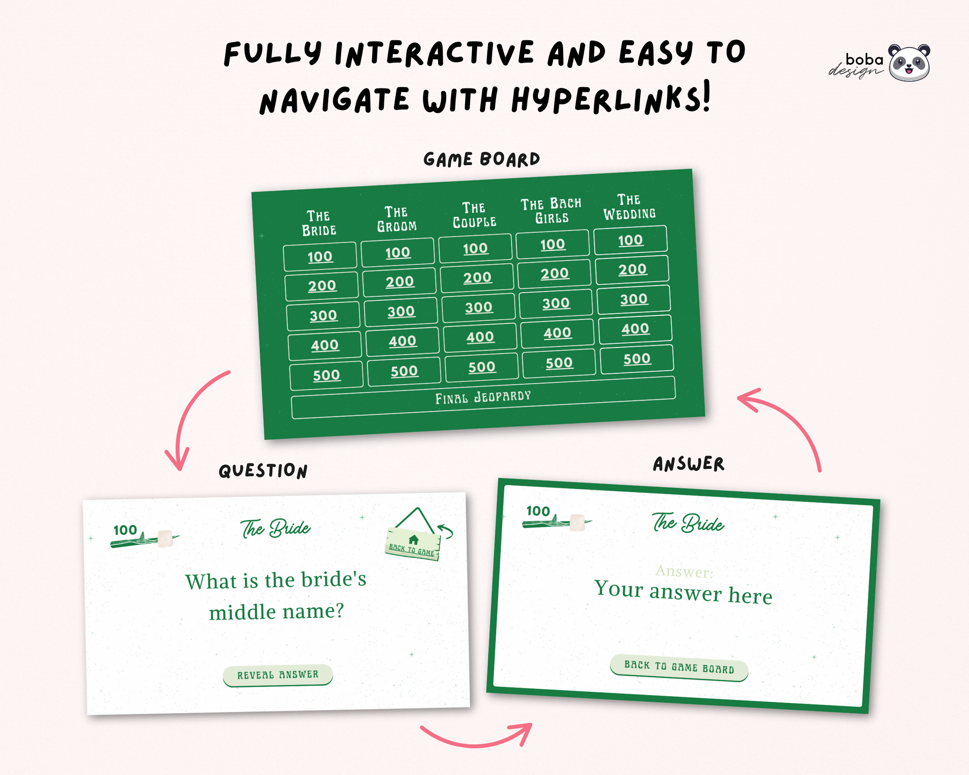 • Interactive buttons for smooth navigation (reveal answers, go back to board, etc.)