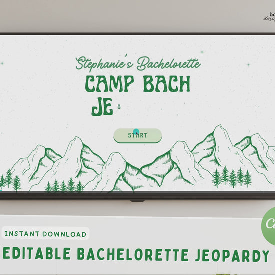 Planning a camping-themed bachelorette party? This green Camp Bachelorette Jeopardy game brings the bride and her bach babes together for a night to remember. Edit the categories and questions in Canva to make it fit your group perfectly.