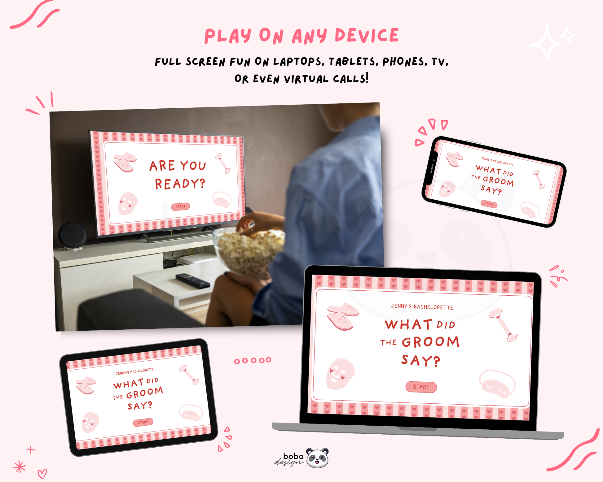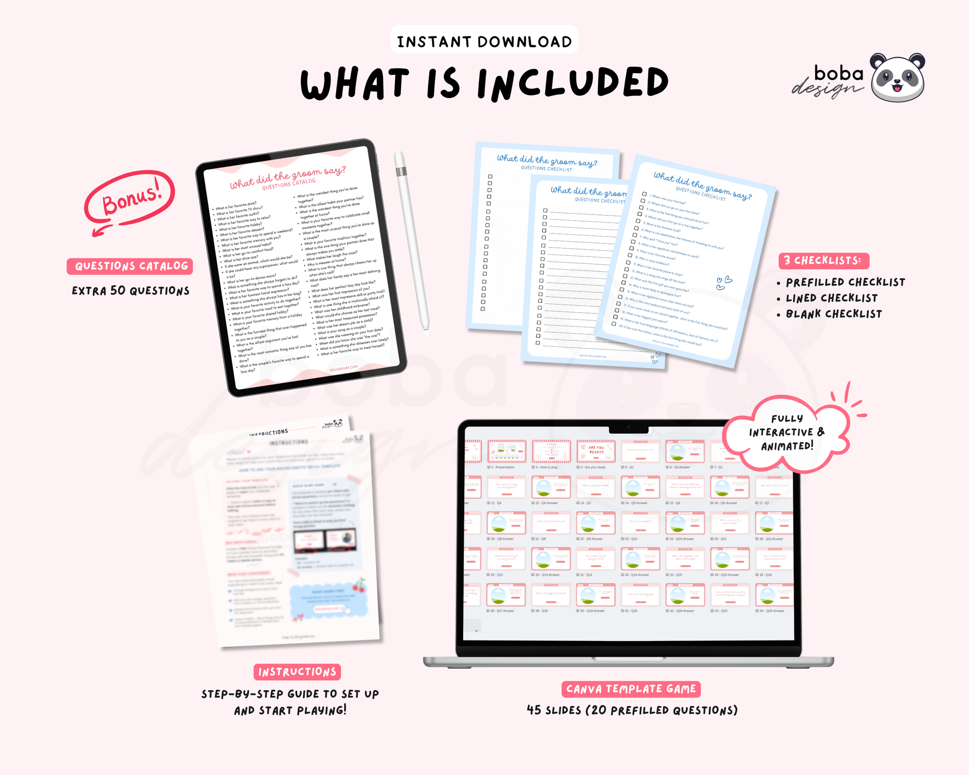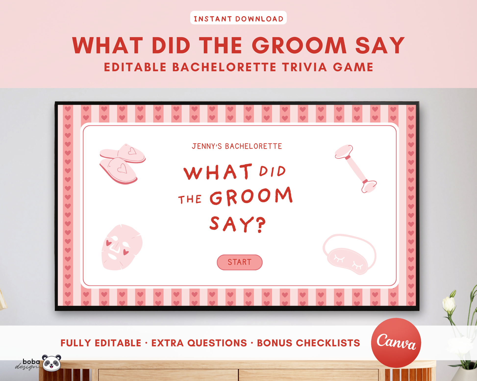 Bring laughs to your bachelorette party with this What Did the Groom Say? game. The bride guesses the groom’s answers to 20 fun questions. Easy to play, fun for everyone, and perfect for making memories with your friends.