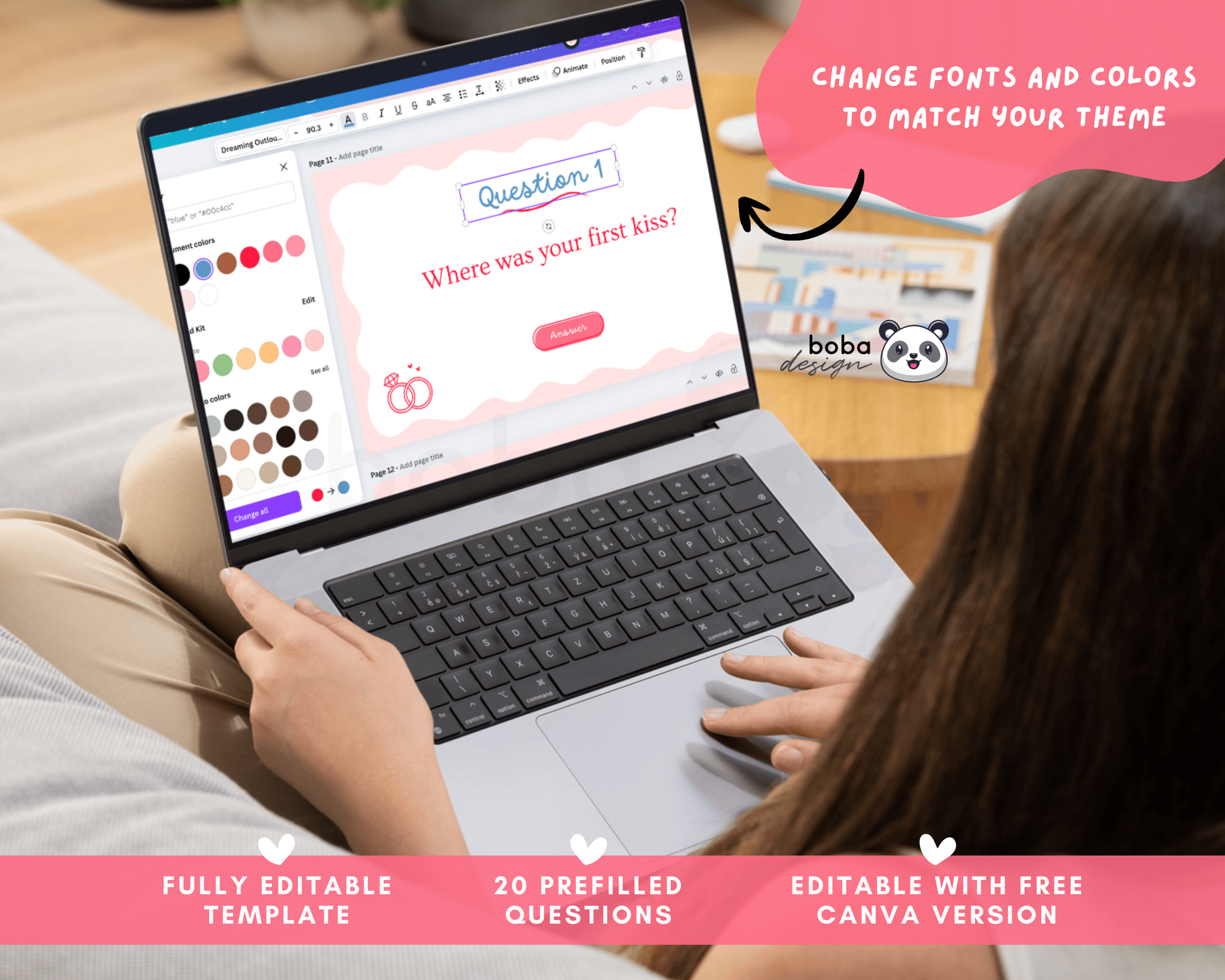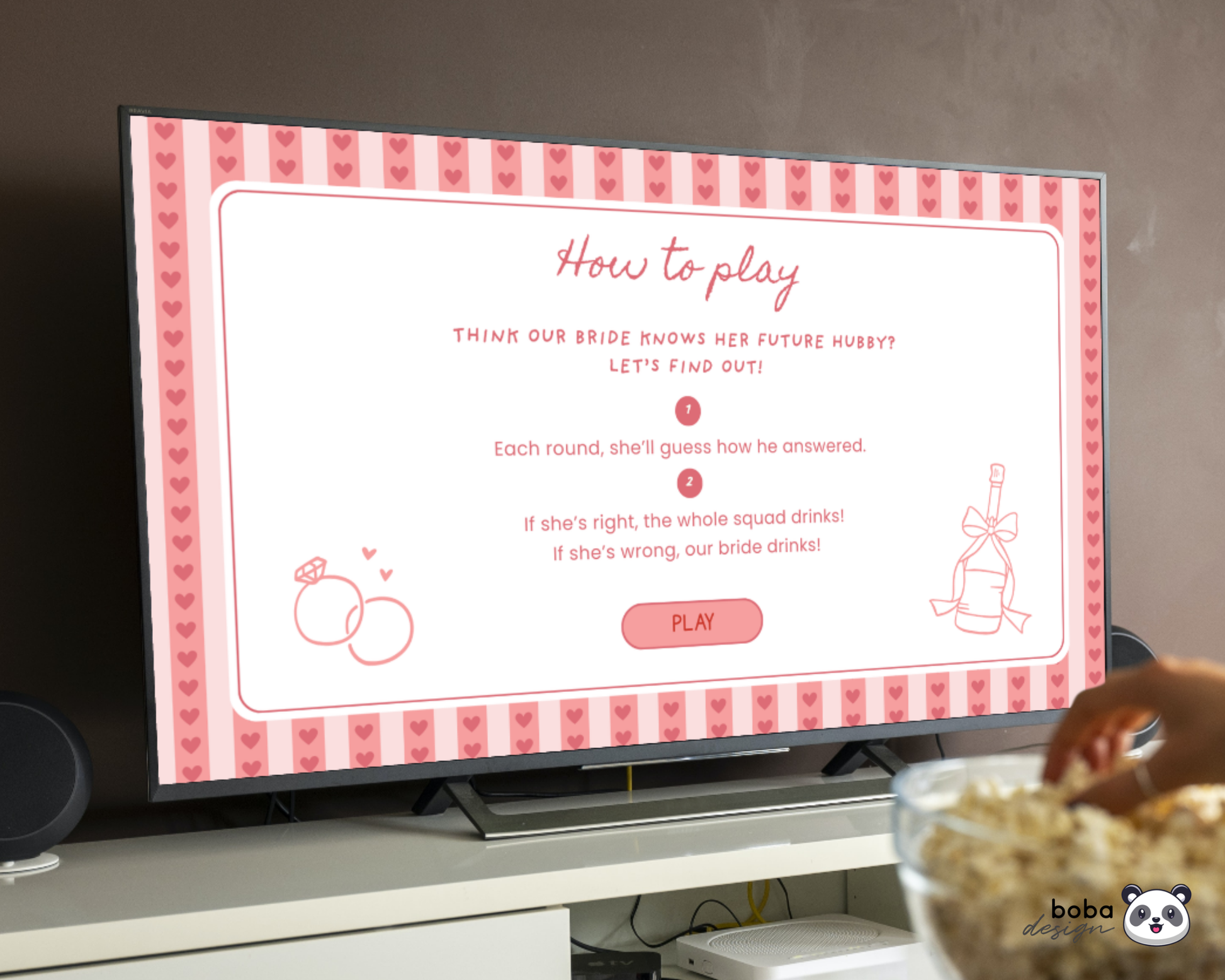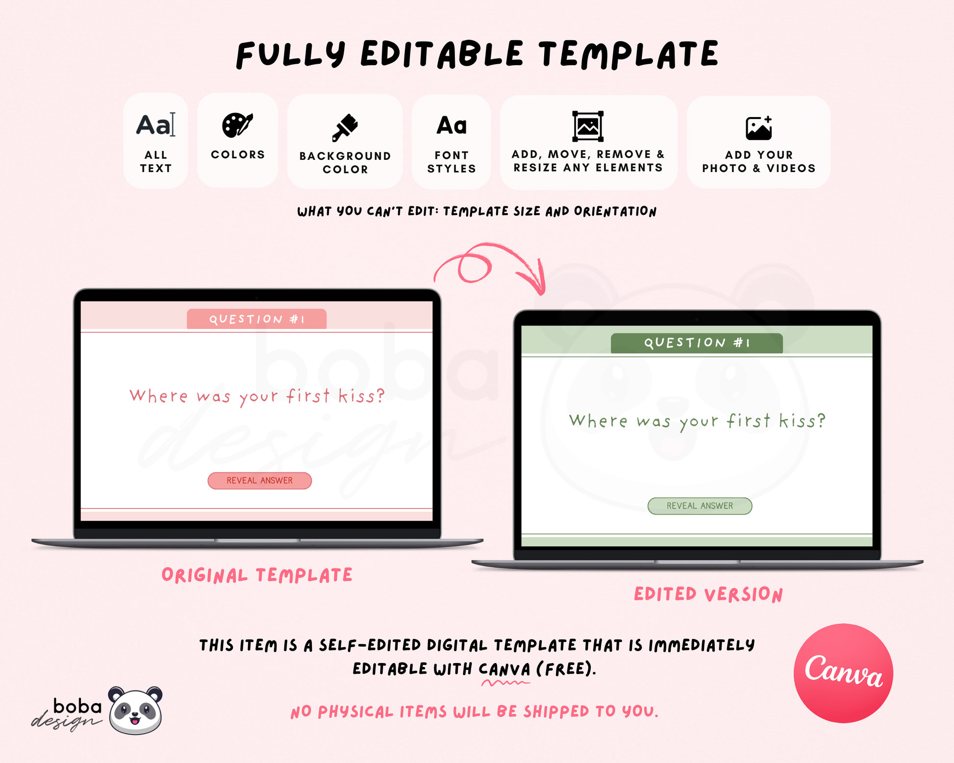 Fully editable in Canva so you can match the colors, text, and questions to your party style.