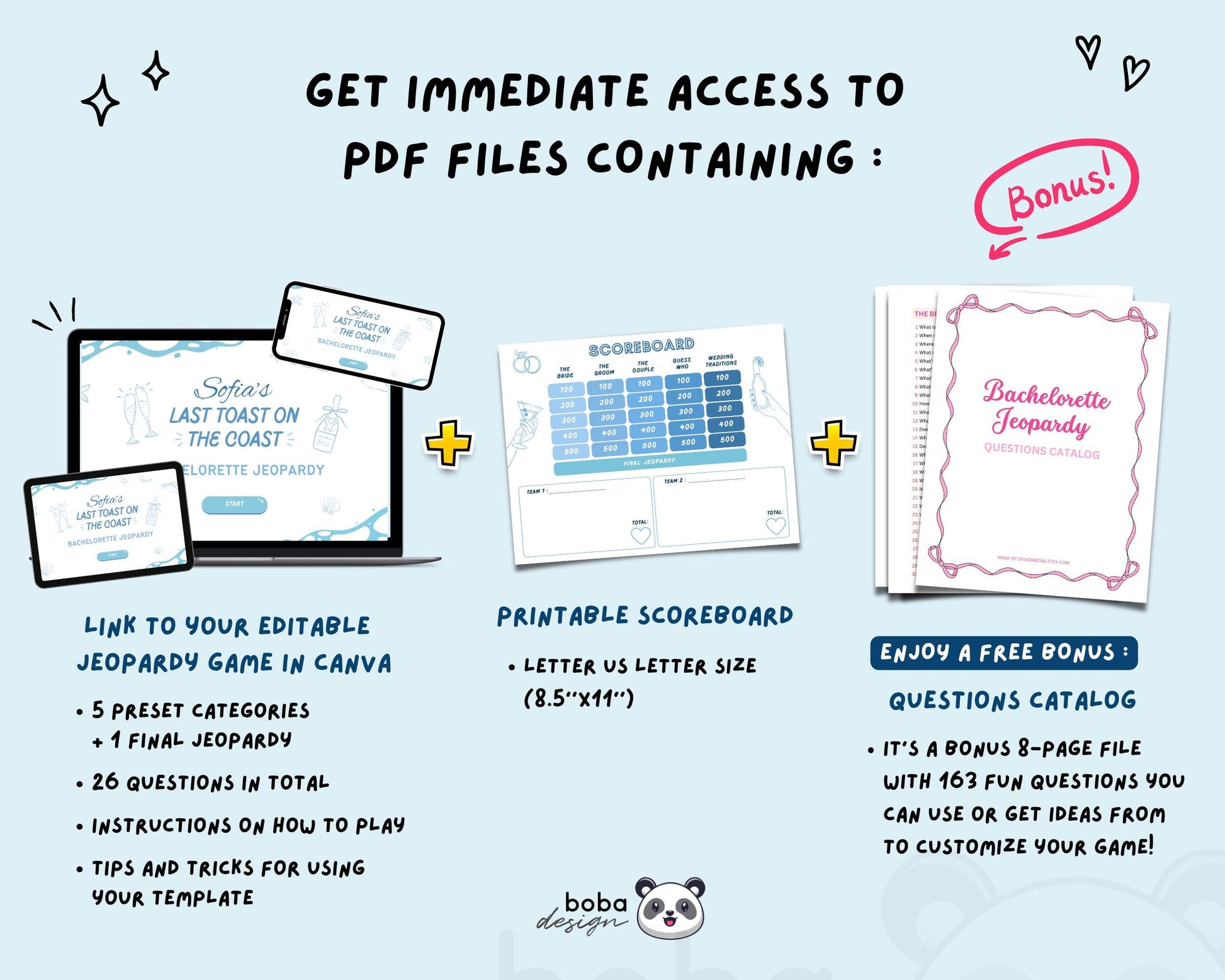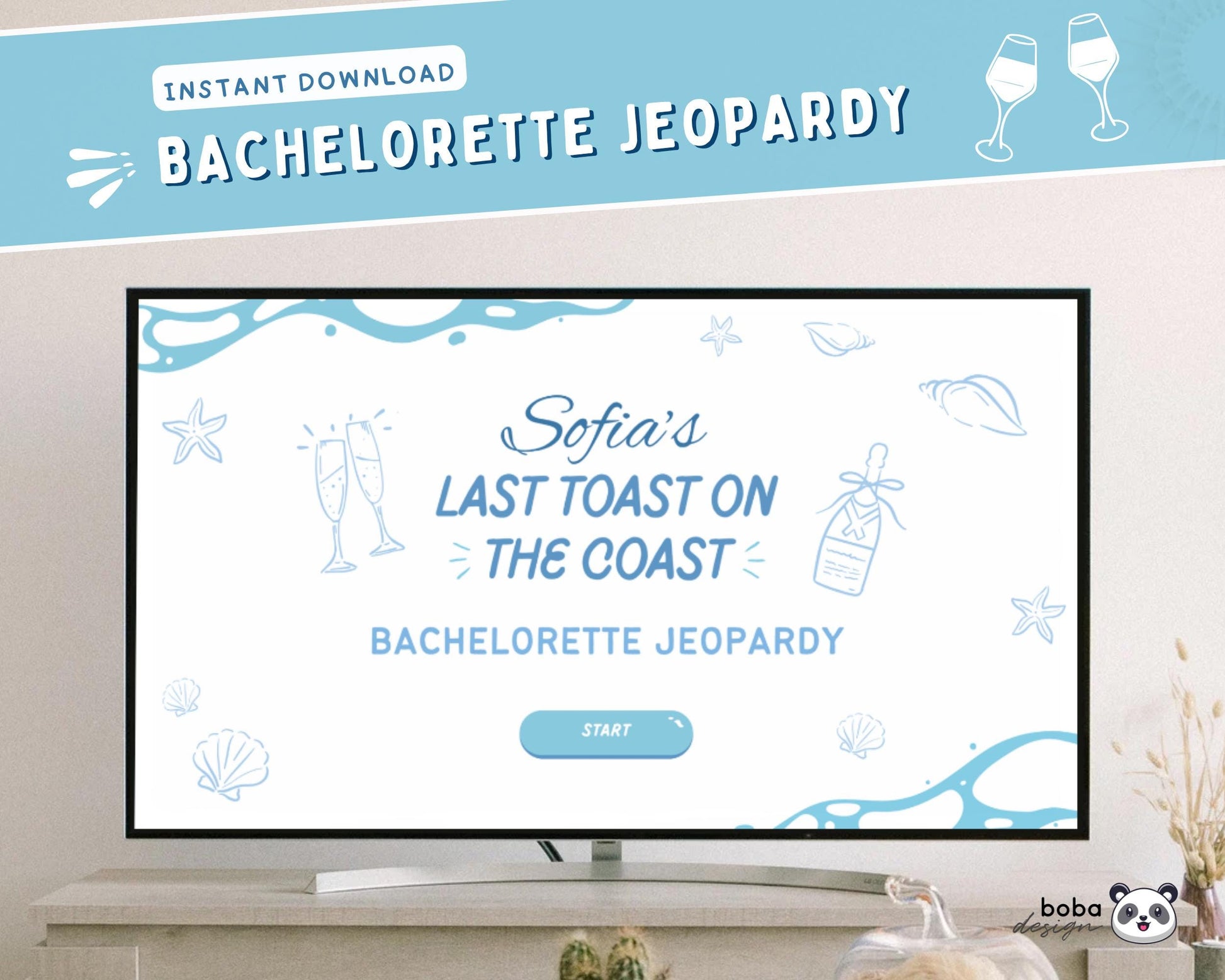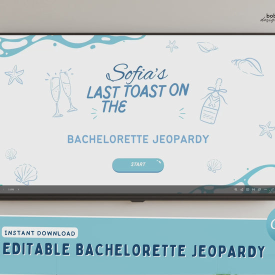 Planning a coastal or something blue bachelorette party? This ocean inspired blue Jeopardy-style game is the perfect way to break the ice and get the party started. Easy to use, fully editable in Canva, and guaranteed to get the group laughing.