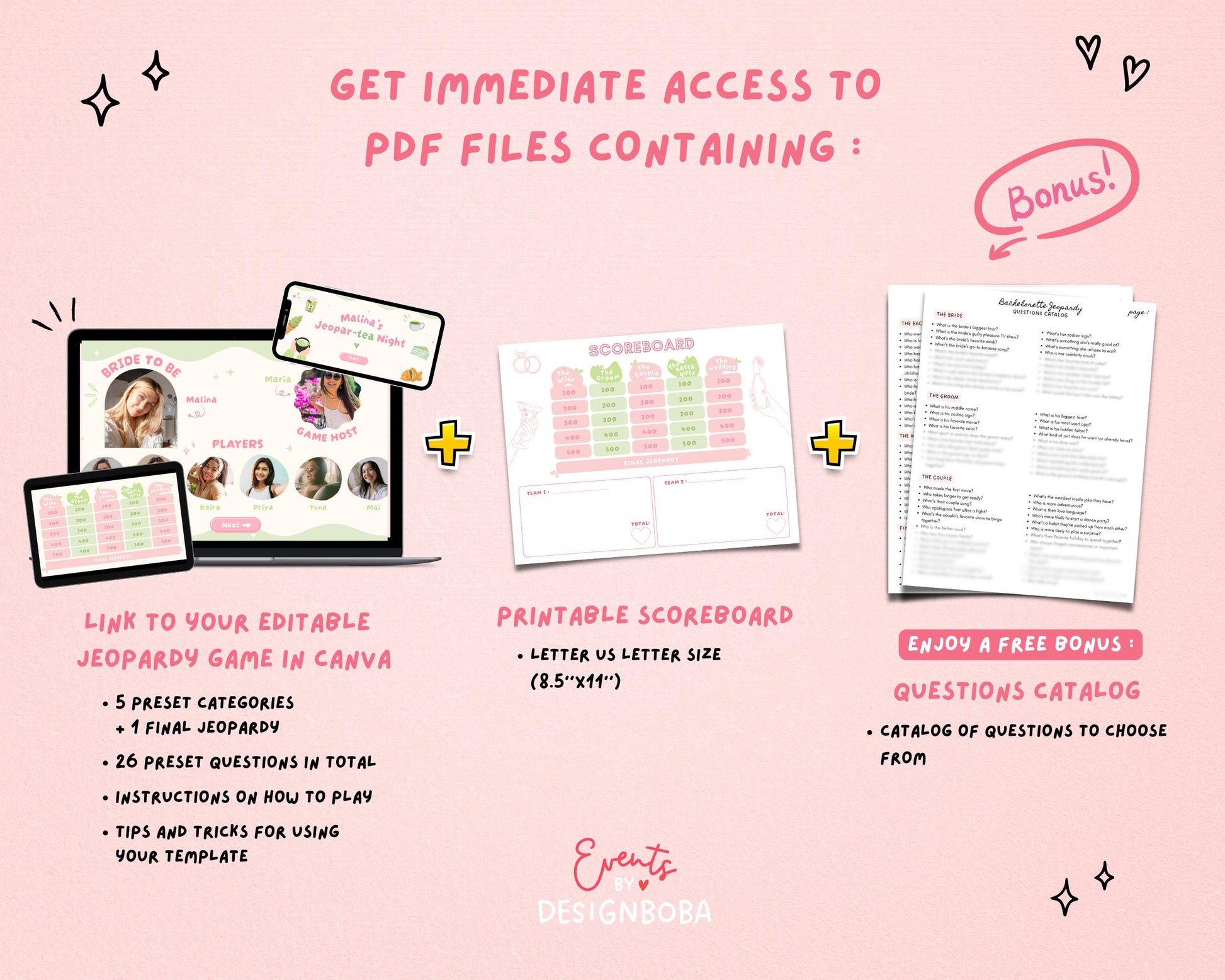 Planning a cozy girls’ night, birthday, or a one-of-a-kind bachelorette party? This matcha-inspired Jeopardy game template blends tea time charm with party fun! Designed with soft matcha green and pastel pink tones, it’s perfect for trivia-loving brides and chill celebrations.