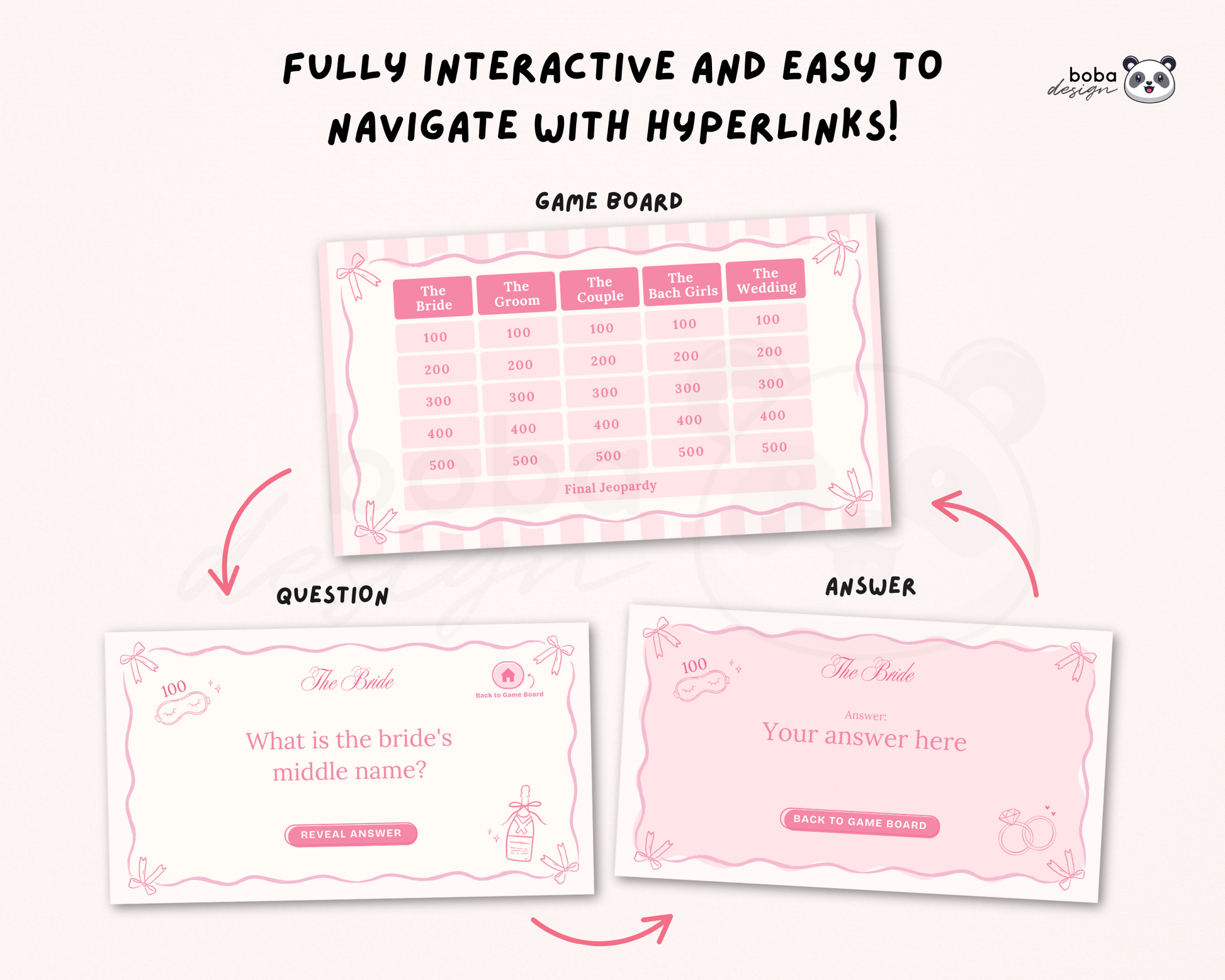 • Interactive buttons for smooth navigation (reveal answers, go back to board, etc.)