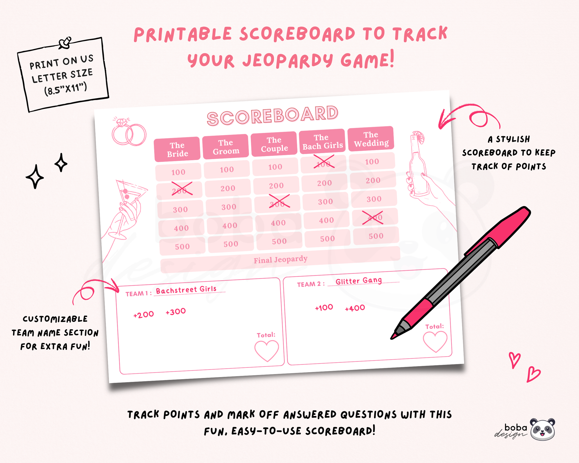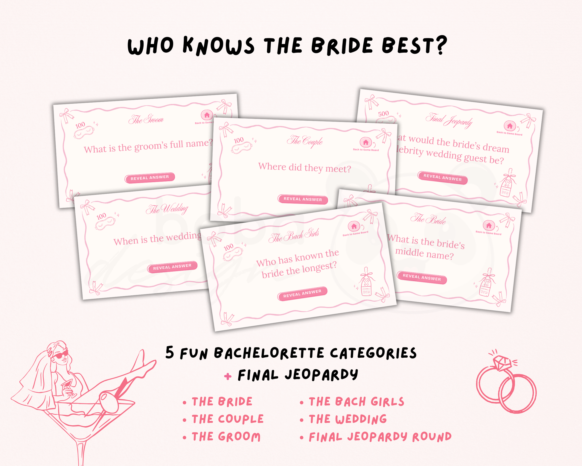 All the questions are centered around the bride, the couple, the wedding, and the bachelorette crew, which makes the bride part of the fun instead of just watching. She can sip every time a team gets an answer wrong, react to the guesses, or step in as the final judge when answers are revealed. It keeps the energy up and guarantees lots of laughs.