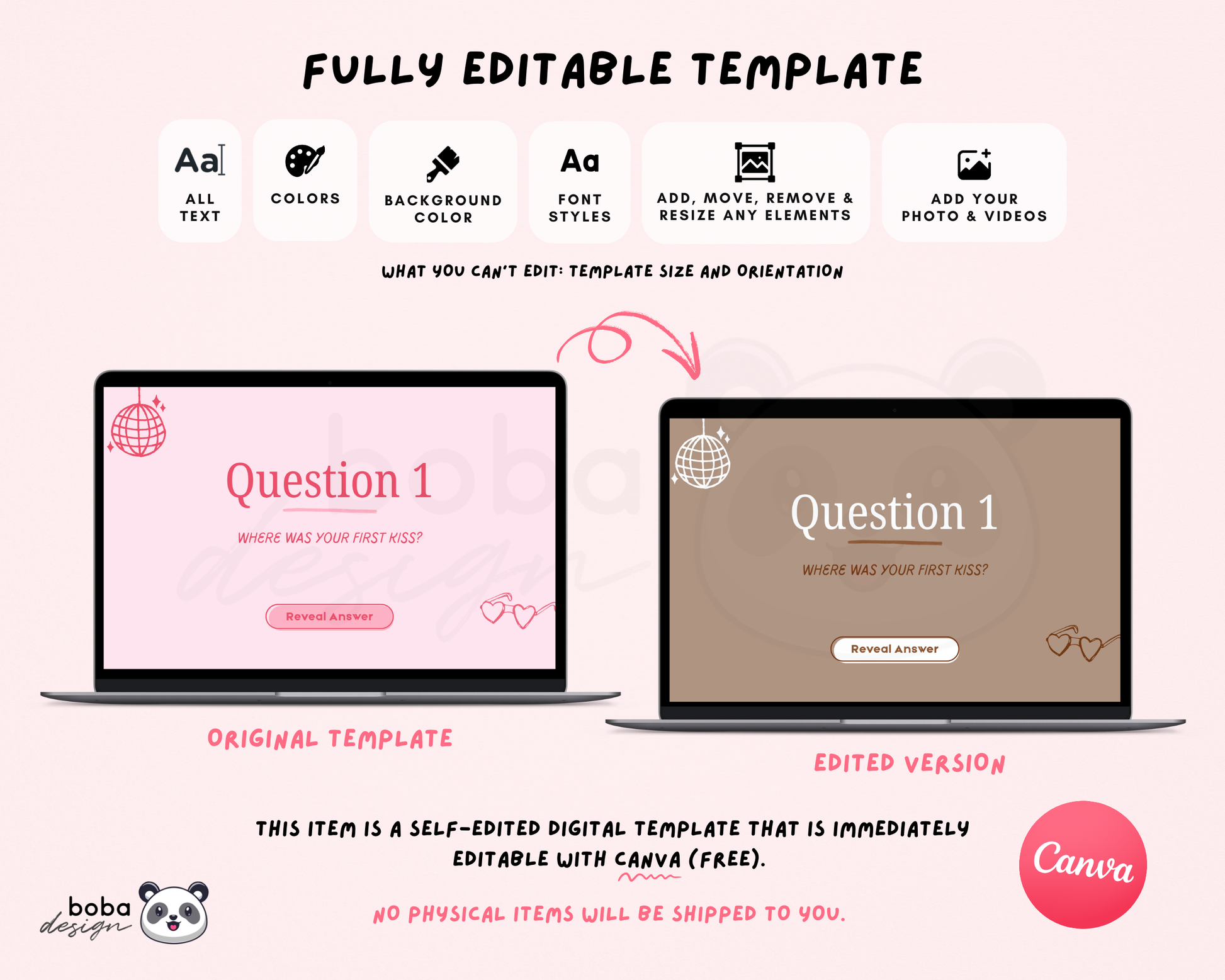 Fully editable in Canva so you can match the colors, text, and questions to your party style.