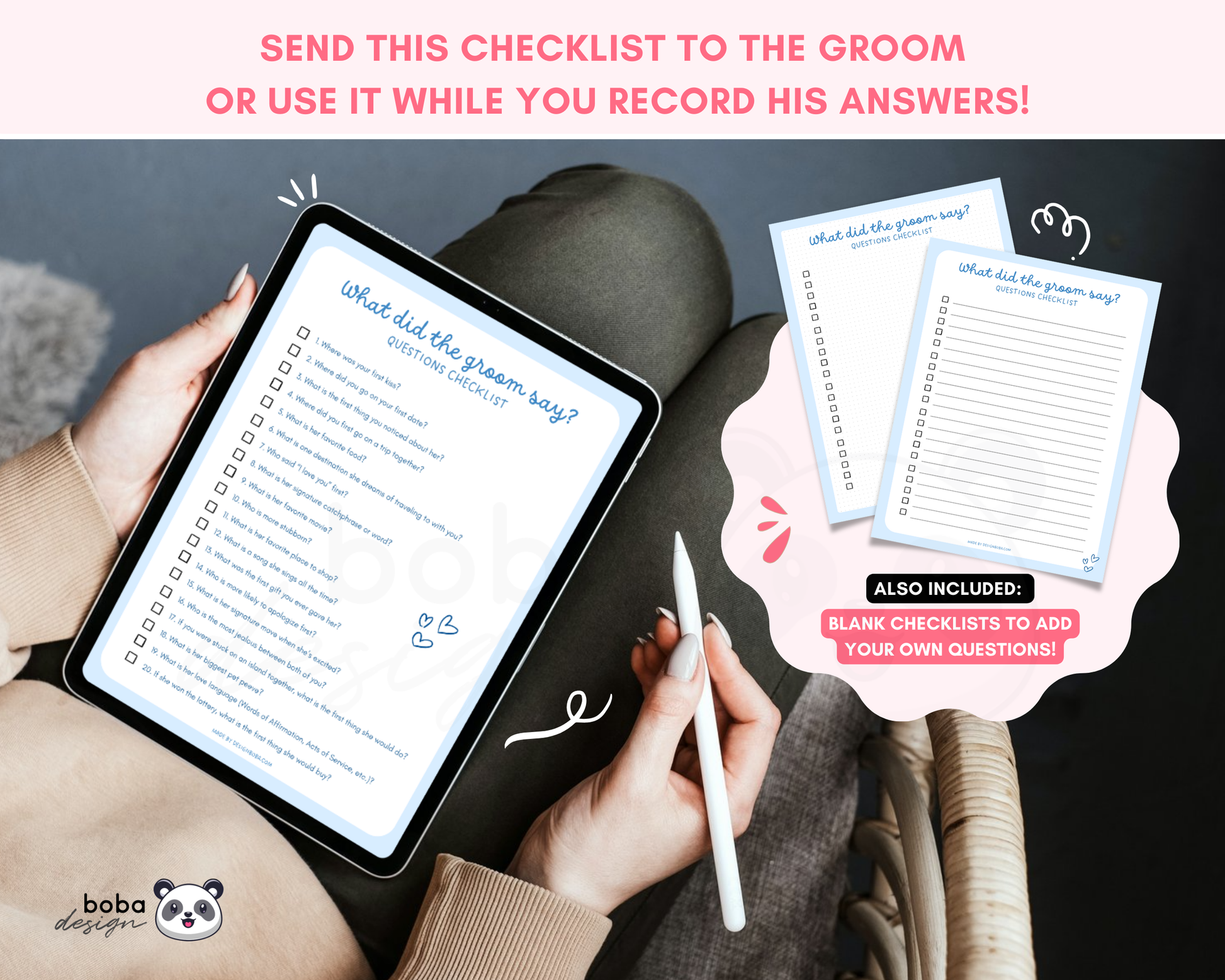 Bring laughs to your bachelorette party with this What Did the Groom Say? game. The bride guesses the groom’s answers to 20 fun questions. Easy to play, fun for everyone, and perfect for making memories with your friends.