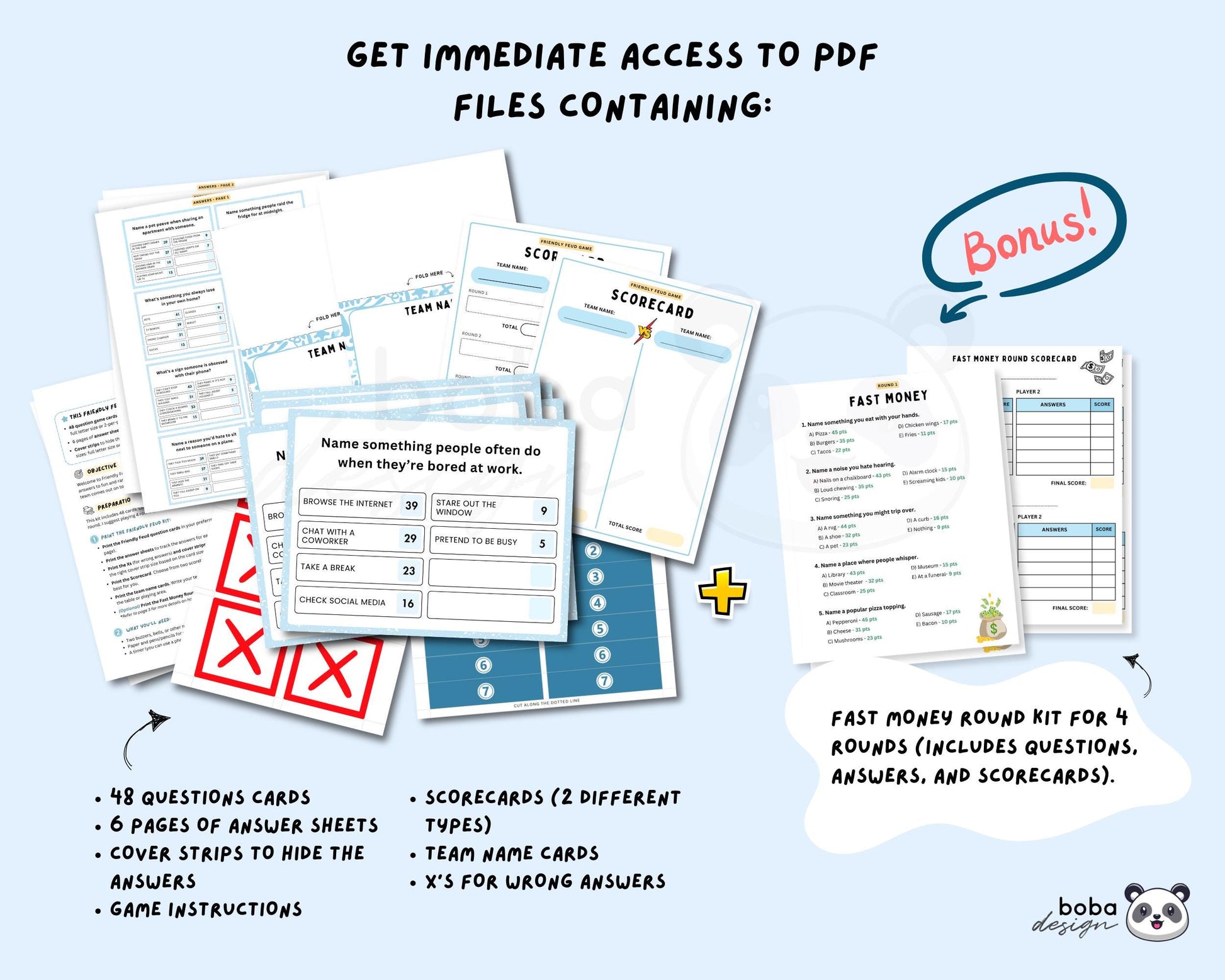With 48 question cards, answer sheets, team name cards, scorecards, and a Fast Money Round kit, you’ll be all set for an unforgettable game night!